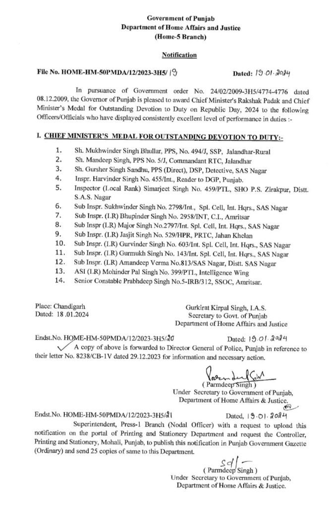 26 ਜਨਵਰੀ ਮੌਕੇ ਇਹਨਾਂ 14 ਪੁਲਿਸ ਮੁਲਾਜ਼ਮਾਂ ਨੂੰ ਮੁੱਖ ਮੰਤਰੀ ਮੈਡਲ ਨਾਲ ਕੀਤਾ ਜਾਵੇਗਾ ਸਨਮਾਨਿਤ