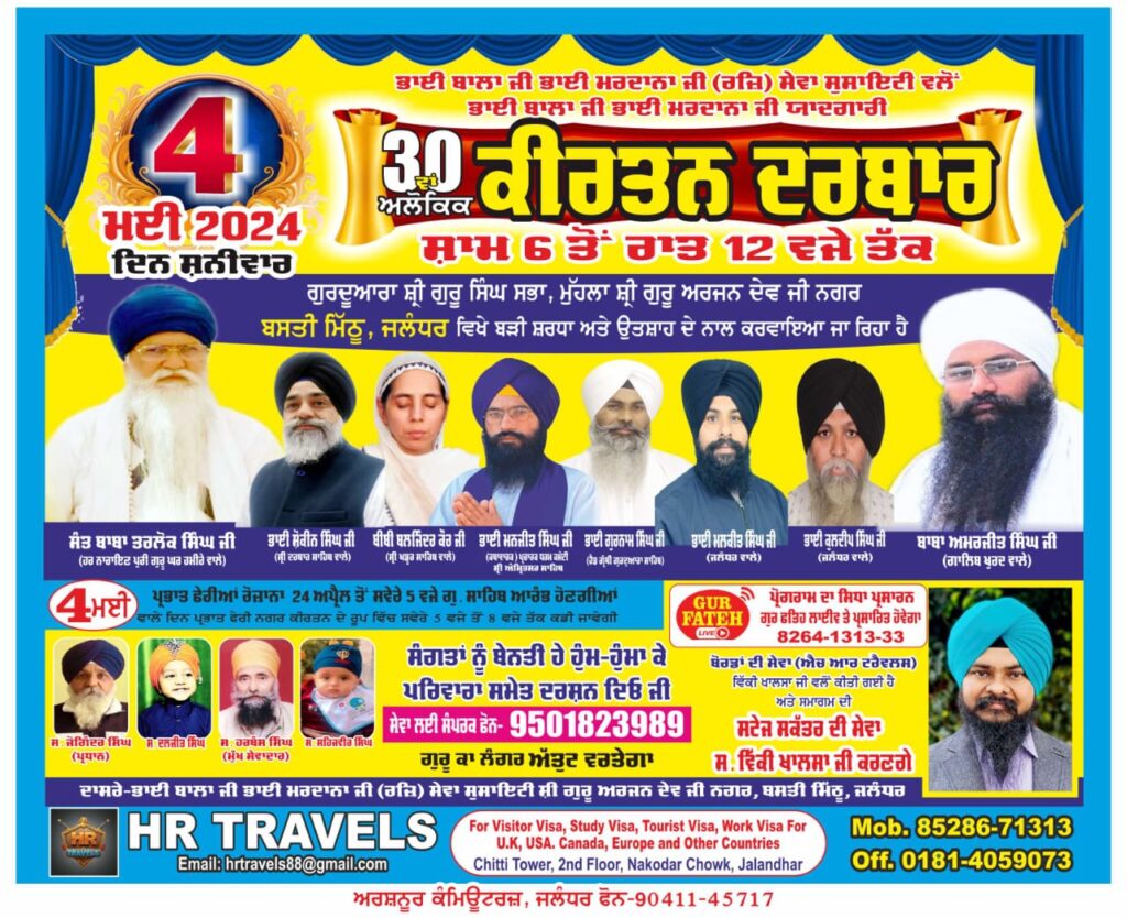 ਜਲੰਧਰ (ਪਰਮਜੀਤ ਸਾਬੀ) – ਭਾਈ ਬਾਲਾ ਜੀ ਭਾਈ ਮਰਦਾਨਾ ਜੀ (ਰਜਿ) ਸੇਵਾ ਸੋਸਾਇਟੀ ਵੱਲੋਂ ਭਾਈ ਬਾਲਾ ਜੀ ਭਾਈ ਮਰਦਾਨਾ ਜੀ ਦੀ ਯਾਦ ਵਿੱਚ ਹਰ ਸਾਲ ਦੀ ਤਰ੍ਹਾਂ 30ਵਾਂ ਮਹਾਨ ਕੀਰਤਨ ਦਰਬਾਰ 4 ਮਈ ਨੂੰ ਦਿਨ ਸ਼ਨੀਵਾਰ ਗੁਰਦੁਆਰਾ ਸ੍ਰੀ ਗੁਰੂ ਸਿੰਘ ਸਭਾ ਮਹੱਲਾ ਸ੍ਰੀ ਗੁਰੂ ਅਰਜਨ ਦੇਵ ਨਗਰ ਖੁੱਲੇ ਪੰਡਾਲ ਵਿੱਚ ਬਸਤੀ ਮਿੱਠੂ ਸਾਮ 6 ਵਜੇ ਤੋਂ 12 ਵਜੇ ਤੱਕ ਕਰਵਾਇਆ ਜਾ ਰਿਹਾ ਹੈ। ਜਿਸ ਵਿੱਚ ਪੰਥ ਪ੍ਰਸਿੱਧ ਸੰਤ ਮਹਾਂਪੁਰਖ,ਰਾਗੀ ਜਥੇ ਅਤੇ ਵਿਦਵਾਨ ਕੀਰਤਨ ਕਥਾ ਰਾਹੀ ਸੰਗਤਾਂ ਨੁੰ ਨਿਹਾਲ ਕਰਨਗੇ। ਜਿੰਨਾ ਵਿੱਚ ਮਹਾਂਪੁਰਖ ਸੰਤ ਬਾਬਾ ਤਰਲੋਕ ਸਿੰਘ ਜੀ (ਹਰਿ ਨਰਾਇਣ ਪੂਰੀ ਗੁਰੂ ਘਰ ਵਾਲੇ,) ਸੰਤ ਬਾਬਾ ਅਮਰਜੀਤ ਸਿੰਘ ਜੀ (ਗ਼ਾਲਿਬ ਖੁਰਦ ਵਾਲੇ) ਭਾਈ ਸ਼ੌਕੀਨ ਸਿੰਘ ਜੀ ਸ੍ਰੀ ਦਰਬਾਰ ਸਾਹਿਬ ਵਾਲੇ,ਭਾਈ ਮਨਜੀਤ ਸਿੰਘ ਜੀ ਕਥਾ ਵਾਚਕ ਧਰਮ ਪ੍ਰਚਾਰ ਕਮੇਟੀ,ਭਾਈ ਗੁਰਨਾਮ ਸਿੰਘ ਜੀ ਹਜੂਰੀ ਰਾਗੀ, ਬੀਬੀ ਬਲਜਿੰਦਰ ਕੌਰ ਖਡੂਰ ਸਾਹਿਬ ਵਾਲੇ,ਭਾਈ ਮਲਕੀਤ ਸਿੰਘ ਜਲੰਧਰ ਵਾਲੇ,ਭਾਈ ਕੁਲਦੀਪ ਸਿੰਘ ਜੀ, ਆਦਿ ਸ਼ਾਮਿਲ ਹਨ।