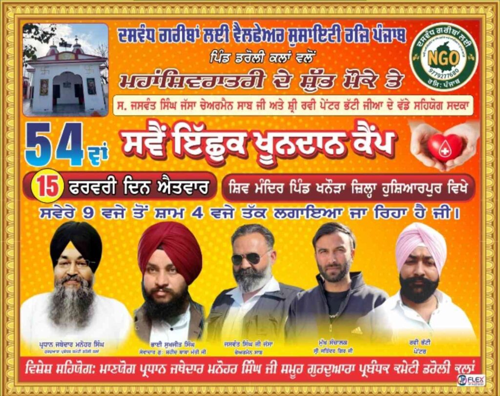 ਦਸਵੰਧ ਗਰੀਬਾਂ ਲਈ ਵੈਲਫੇਅਰ ਸੋਸਾਇਟੀ ਵੱਲੋਂ ਮਹਾਂ ਸ਼ਿਵਰਾਤਰੀ ਦੇ ਸ਼ੁਭ ਮੌਕੇ ਤੇ ਸਵੈ ਇਛੁੱਕ ਖੂਨ ਦਾਨ ਕੈਂਪ ਲਗਾਇਆ ਜਾ ਰਿਹਾ ਹੈ
