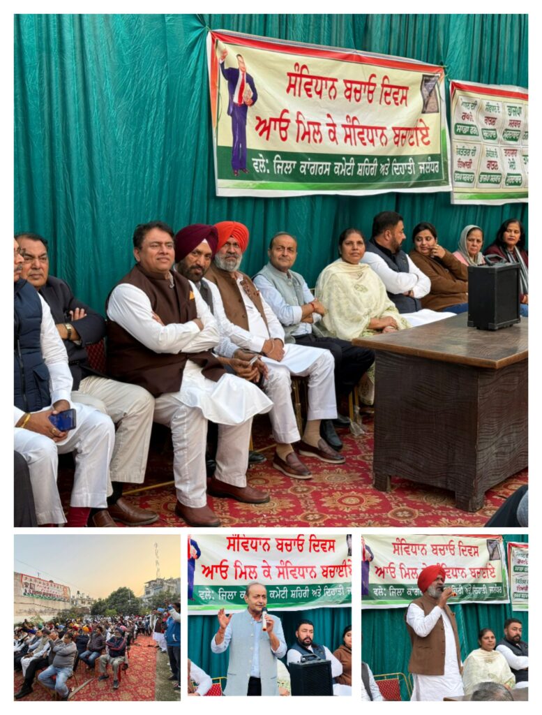 ਜਲੰਧਰ – ਅੱਜ ਕਾਂਗਰਸ ਭਵਨ ਜਲੰਧਰ ਵਿਖੇ ਆਲ ਇੰਡੀਆ ਕਾਂਗਰਸ ਕਮੇਟੀ ਅਤੇ ਪੰਜਾਬ ਪ੍ਰਦੇਸ਼ ਕਾਂਗਰਸ ਕਮੇਟੀ ਦੇ ਆਦੇਸ਼ ਅਨੁਸਾਰ ਸੰਵਿਧਾਨ ਬਚਾਓ ਦਿਵਸ ਮਨਾਇਆ ਗਿਆ । ਇਸ ਮੌਕੇ ਤੇ ਕਾਂਗਰਸੀ ਆਗੂਆਂ ਨੇ ਕਿਹਾ ਕਿ ਅੱਜ ਕੇਂਦਰ ਦੀ ਸਰਕਾਰ ਜਿਸ ਤਰਾਂ ਸੰਵਿਧਾਨ ਨਾਲ ਛੇੜ ਛਾੜ ਕਰ ਰਹੀ ਹੈ । ਇਹ ਬਿਲਕੁਲ ਵੀ ਬਰਦਾਸ਼ਤ ਨਹੀਂ ਹੈ । ਜਿਸ ਤਰਾਂ ਕੇਂਦਰ ਦੀ ਸਰਕਾਰ ਧੱਕੇਸ਼ਾਹੀ ਕਰ ਰਹੀ ਹੈ , ਇਹ ਜਿਆਦਾ ਸਮਾਂ ਚੱਲਣ ਵਾਲੀ ਨਹੀ ਹੈ । ਇਹ ਸਰਕਾਰ ਸੰਵਿਧਾਨ ਦੀ ਕਾਤਲ ਸਰਕਾਰ ਹੈ । ਦੇਸ਼ ਦਾ ਸੰਵਿਧਾਨ ਸਾਨੂੰ ਬਰਾਬਰ ਰਹਿਣ ਦਾ ਅਧਿਕਾਰ ਦਿੰਦਾ ਹੈ । ਇਸ ਮੌਕੇ ਤੇ ਰਜਿੰਦਰ ਬੇਰੀ ਪ੍ਰਧਾਨ ਜਿਲਾ ਕਾਂਗਰਸ ਕਮੇਟੀ ਸ਼ਹਿਰੀ, ਹਰਦੇਵ ਸਿੰਘ ਲਾਡੀ ਸ਼ੇਰੋਵਾਲੀਆਂ ਵਿਧਾਇਕ ਅਤੇ ਪ੍ਰਧਾਨ ਜਿਲਾ ਕਾਂਗਰਸ ਕਮੇਟੀ ਦਿਹਾਤੀ, ਨਵਜੋਤ ਸਿੰਘ ਦਾਹੀਆ ਹਲਕਾ ਇੰਚਾਰਜ ਨਕੋਦਰ, ਸੁਰਿੰਦਰ ਕੋਰ ਹਲਕਾ ਇੰਚਾਰਜ ਜਲੰਧਰ ਵੈਸਟ, ਰਜਿੰਦਰ ਸਿੰਘ ਸਾਬਕਾ ਐਸ ਐਸ ਪੀ ਹਲਕਾ ਇੰਚਾਰਜ ਕਰਤਾਰਪੁਰ, ਰਜਿੰਦਰ ਪਾਲ ਸਿੰਘ ਰਾਣਾ ਰੰਧਾਵਾ, ਪਵਨ ਕੁਮਾਰ, ਪਰਮਜੋਤ ਸਿੰਘ ਸ਼ੈਰੀ ਚੱਢਾ, ਰਾਜੇਸ਼ ਜਿੰਦਲ, ਹਰਮੀਤ ਸਿੰਘ, ਮਨਦੀਪ ਕੌਰ, ਮੀਨੂ ਬੱਗਾ, ਰਸ਼ਪਾਲ ਜੱਖੂ, ਜਗਜੀਤ ਕੰਬੋਜ, ਦੀਪਕ ਸ਼ਰਮਾ ਮੋਨਾ, ਕੰਚਨ ਠਾਕੁਰ, ਰੇਨੂੰ ਸੇਠ, ਨਰੇਸ਼ ਵਰਮਾ, ਅਰੁਣ ਰਤਨ, ਮਨਮੋਹਨ ਸਿੰਘ ਬਿੱਲਾ, ਜਗਜੀਤ ਜੀਤਾ, ਰੋਹਨ ਚੱਢਾ, ਗੁਰਨਾਮ ਸਿੰਘ ਮੁਲਤਾਨੀ, ਜਤਿੰਦਰ ਜੋਨੀ, ਹਰਪਾਲ ਮਿੰਟੂ, ਗੁਰਵਿੰਦਰ ਪਾਲ ਸਿੰਘ ਬੰਟੀ ਨੀਲਕੰਠ, ਮਹਿੰਦਰ ਸਿੰਘ ਗੁੱਲੂ, ਬਲਰਾਜ ਠਾਕੁਰ, ਹਰਲਗਨ ਸਿੰਘ, ਨਵਦੀਪ ਜਰੇਵਾਲ, ਦਵਿੰਦਰ ਸ਼ਰਮਾ ਬੌਬੀ, ਗੌਰਵ ਸ਼ਰਮਾ ਨੋਨੀ, ਹਰਪ੍ਰੀਤ ਵਾਲੀਆਂ, ਦਿਨੇਸ਼ ਹੀਰ, ਨੀਰਜ ਜੱਸਲ, ਸੁਖਵਿੰਦਰ ਸੁੱਚੀ ਪਿੰਡ, ਮਨਦੀਪ ਜੱਸਲ, ਵਿਜੇ ਦਕੋਹਾ, ਮੰਗਾ ਮੁੱਧੜ, ਜਗਦੀਸ਼ ਗੱਗ, ਸੁਰਿੰਦਰ ਪੱਪਾ, ਸੁਨੀਲ ਸ਼ਰਮਾ, ਰਤਨੇਸ਼ ਸੈਣੀ, ਬਲਜੀਤ ਸਿੰਘ, ਗੁਲਸ਼ਨ ਕੁਮਾਰ, ਹਰਮੀਤ ਸਿੰਘ, ਤਰਲੋਕ ਸਿੰਘ, ਸਤਪਾਲ ਮਿੱਕਾ, ਵਿਕਰਮ ਸ਼ਰਮਾ, ਮੁਨੀਸ਼ ਪਾਹਵਾ, ਕਰਨ ਵਰਮਾ, ਅਸ਼ਵਨੀ ਜੰਗਰਾਲ, ਸੰਜੀਵ ਦੁਆ, ਸੁਧੀਰ ਘੁੱਗੀ, ਪਰਮਿੰਦਰ ਸਿੰਘ ਮੱਲੀ, ਸੋਮ ਰਾਜ ਸੋਮੀ, ਬਲਦੇਵ ਰਾਜ, ਹੁਸਨ ਲਾਲ, ਰਵਿੰਦਰ ਲਾਡੀ, ਪਰਮਜੀਤ ਬਲ, ਪੁਸ਼ਪਿੰਦਰ ਲਾਲੀ, ਪ੍ਰੇਮ ਪਾਲ ਡੁਮੇਲੀ, ਰਵੀ ਬੱਗਾ, ਸੁਦੇਸ਼ ਭਗਤ, ਸੁਰਜੀਤ ਕੌਰ, ਸਤਨਾਮ ਸਿੰਘ, ਬੱਬੂ ਸਿਡਾਨਾ, ਕੁਲਬਰਨ ਸਿੰਘ, ਆਨੰਦ ਬਿੱਟੂ, ਰਾਜੀਵ ਸ਼ਰਮਾ, ਅਤੁਲ ਚੱਢਾ, ਮੁਖਤਿਆਰ ਅਹਿਮਦ, ਦਵਿੰਦਰ ਸਿੰਘ, ਜੋਗਿੰਦਰ ਸਿੰਘ, ਮਨੀ ਧੀਰ, ਮਾਸਟਰ ਸ਼ਰੀਫ਼ ਚੰਦ, ਭਾਰਤ ਭੂਸ਼ਣ, ਚੂਨੀ ਲਾਲ, ਸਲਿੰਦਰ ਕੰਡੀ, ਸੁਰਿੰਦਰ ਚੌਧਰੀ, ਗੌਤਮ ਖੋਸਲਾ, ਨਿਸ਼ਾਂਤ ਘਈ, ਵਿਕਰਮ ਦੱਤਾ, ਆਦੇਸ਼ ਕੁਮਾਰ, ਕਰਨ ਕੌਸ਼ਲ, ਅਕਸ਼ਵੰਤ ਖੋਸਲਾ, ਅਸ਼ਵਨੀ ਸੋਂਧੀ, ਵਿਪਨ ਕੁਮਾਰ, ਜਗਦੀਪ ਸੋਨੂੰ ਸੰਧਰ, ਪੱਲਵੀ, ਲੇਖ ਰਾਜ ਮੌਜੂਦ ਸਨ।