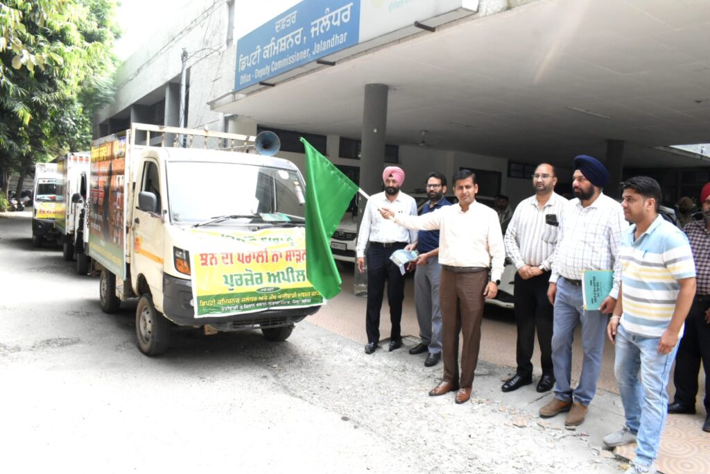ਜਲੰਧਰ, 25 ਸਤੰਬਰ:- ਫ਼ਸਲਾਂ ਦੀ ਰਹਿੰਦ-ਖੂੰਹਦ ਸਾੜਨ ਦੇ ਰੁਝਾਨ ਨੂੰ ਜ਼ਮੀਨੀ ਪੱਧਰ ’ਤੇ ਠੱਲ੍ਹ ਪਾਉਣ ਲਈ ਬਹੁ-ਪੱਖੀ ਰਣਨੀਤੀ ਅਪਣਾਉਂਦੇ ਹੋਏ ਡਿਪਟੀ ਕਮਿਸ਼ਨਰ ਡਾ. ਹਿਮਾਂਸ਼ੂ ਅਗਰਵਾਲ ਵੱਲੋਂ ਅੱਜ ਹਾਟ ਸਪਾਟ ਪਿੰਡਾਂ ਵਿੱਚ ਕਿਸਾਨਾਂ ਨੂੰ ਜਾਗਰੂਕ ਕਰਨ ਲਈ ਤਿੰਨ ਜਾਗਰੂਕਤਾ ਵੈਨਾਂ ਨੂੰ ਹਰੀ ਝੰਡੀ ਦਿਖਾ ਕੇ ਰਵਾਨਾ ਕੀਤਾ ਗਿਆ।