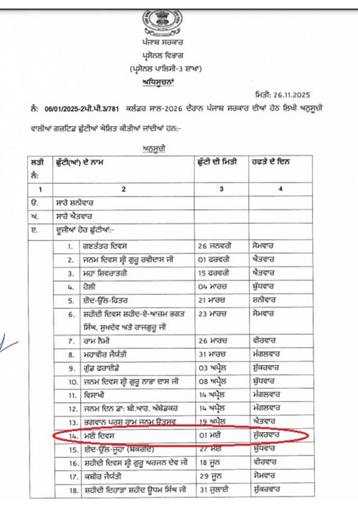 ਹਰ ਸਾਲ ਮਨਾਏ ਜਾਂਦੇ ਮਜ਼ਦੂਰ ਦਿਵਸ ਦੇ ਸਬੰਧ ਵਿੱਚ ਇਸ ਦਿਨ ਪੰਜਾਬ ਦੇ ਸਾਰੇ ਸਰਕਾਰੀ ਦਫ਼ਤਰ, ਬੋਰਡ, ਕਾਰਪੋਰੇਸ਼ਨ ਅਤੇ ਸਰਕਾਰੀ ਵਿੱਦਿਅਕ ਅਦਾਰੇ ਬੰਦ ਰਹਿਣਗੇ।
