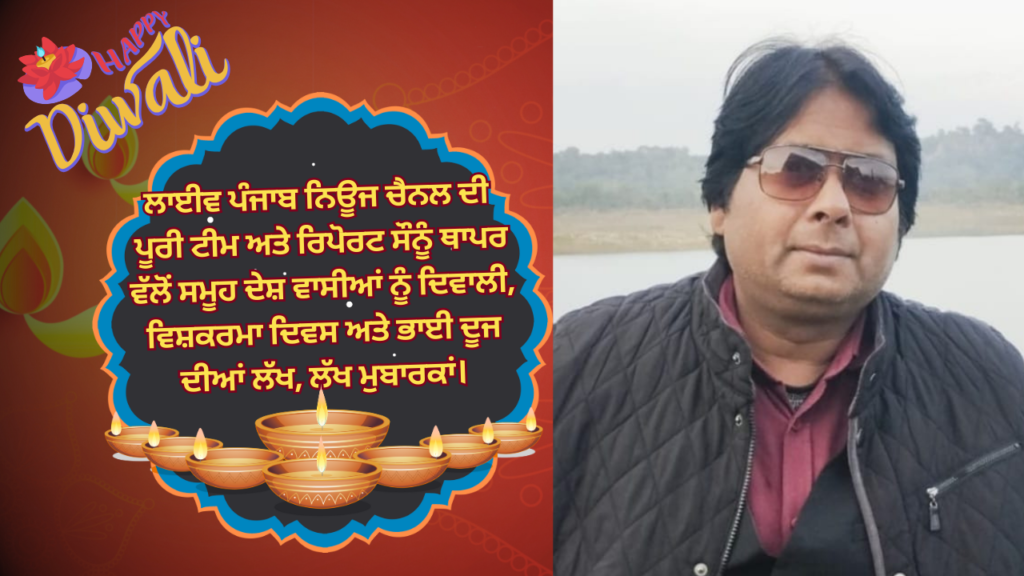 ਲਾਈਵ ਪੰਜਾਬ ਨਿਊਜ ਚੈਨਲ ਦੀ ਪੂਰੀ ਟੀਮ ਅਤੇ ਰਿਪੋਰਟ ਸੌਨੂੰ ਥਾਪਰ ਵੱਲੋਂ ਸਮੂਹ ਦੇਸ਼ ਵਾਸੀਆਂ ਨੂੰ ਦਿਵਾਲੀ, ਵਿਸ਼ਕਰਮਾ ਦਿਵਸ ਅਤੇ ਭਾਈ ਦੂਜ ਦੀਆਂ ਲੱਖ, ਲੱਖ ਮੁਬਾਰਕਾਂ।