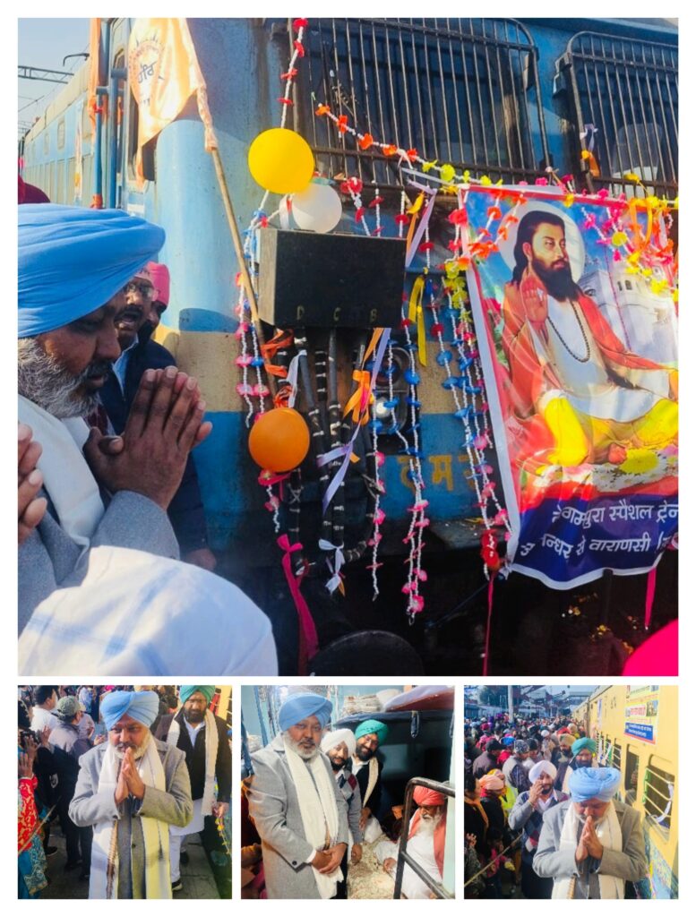 ਜਲੰਧਰ, 29 ਜਨਵਰੀ: ਪੰਜਾਬ ਦੇ ਕੈਬਨਿਟ ਮੰਤਰੀ ਹਰਪਾਲ ਸਿੰਘ ਚੀਮਾ ਅਤੇ ਲਾਲ ਚੰਦ ਕਟਾਰੂਚੱਕ ਨੇ ਅੱਜ ਸ੍ਰੀ ਗੁਰੂ ਰਵਿਦਾਸ ਜੀ ਦਾ ਪ੍ਰਕਾਸ਼ ਪੁਰਬ ਮਨਾਉਣ ਲਈ ਸ਼ਹਿਰ ਦੇ ਰੇਲਵੇ ਸਟੇਸ਼ਨ ਤੋਂ ਬਨਾਰਸ ਲਈ ਸ਼ਰਧਾਲੂਆਂ ਦੀ ਟ੍ਰੇਨ ਨੂੰ ਹਰੀ ਝੰਡੀ ਦਿਖਾ ਕੇ ਰਵਾਨਾ ਕਰਦਿਆਂ ਲੋਕਾਂ ਨੂੰ ਆਦਰਸ਼ਵਾਦੀ ਸਮਾਜ ਦੀ ਸਿਰਜਣਾ ਲਈ ਸ੍ਰੀ ਗੁਰੂ ਰਵਿਦਾਸ ਮਹਾਰਾਜ ਜੀ ਵੱਲੋਂ ਦਿਖਾਏ ਸਰਬ-ਸਾਂਝੀਵਾਲਤਾ ਦੇ ਮਾਰਗ ’ਤੇ ਚੱਲਣ ਦਾ ਸੱਦਾ ਦਿੱਤਾ।