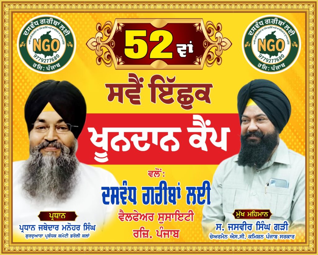 ਇਸ ਦੋਰਾਨ ਪੱਤਰਕਾਰਾਂ ਨਾਲ ਗੱਲਬਾਤ ਕਰਦਿਆਂ ਸੇਵਾਦਾਰ ਭਾਈ ਸੁਖਜੀਤ ਸਿੰਘ ਨੇ ਦੱਸਿਆ ਕਿ ਦਸਵੰਧ ਗਰੀਬਾਂ ਲਈ ਵੈਲਫੇਅਰ ਸੁਸਾਇਟੀ ਗੁਰਦੁਆਰਾ ਪ੍ਰਬੰਧਕ ਕਮੇਟੀ,ਨਗਰ ਨਿਵਾਸੀ ਇਲਾਕਾ ਨਿਵਾਸੀ ਗ੍ਰਾਮ ਪੰਚਾਇਤ ਅਤੇ ਐਨ ਆਰ ਆਈ ਵੀਰਾਂ ਭੈਣਾਂ ਦੇ ਵੱਡੇ ਸਹਿਯੋਗ ਨਾਲ ਮਾਨਵਤਾ ਦੀ ਸੱਚੀ ਸੁੱਚੀ ਸੇਵਾ ਤਹਿਤ ਵੱਖ ਵੱਖ ਕਾਰਜ ਕਰਦੀ ਰਹਿੰਦੀ ਹੈ ਜਿਸ ਦੌਰਾਨ ਇਸ 52 ਸਵੈਂ ਇੱਛੁਕ ਖੂਨਦਾਨ ਕੈਂਪ ਵਿੱਚ ਵਿਸ਼ੇਸ਼ ਕਰਕੇ ਟੀਮ ਦੀ ਹੌਸਲਾ ਅਫਜ਼ਾਈ ਕਰਨ ਲਈ ਬਤੋਰ ਮੁੱਖ ਮਹਿਮਾਨ