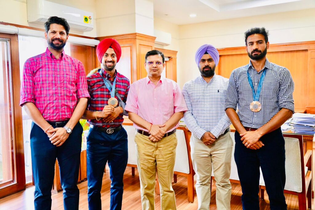 ਚੰਡੀਗੜ੍ਹ, 19 ਅਗਸਤ – ਪੈਰਿਸ ਓਲੰਪਿਕਸ ’ਚ ਹਾਕੀ ਵਿੱਚ ਕਾਂਸੀ ਤਮਗ਼ਾ ਜੇਤੂ ਪੰਜਾਬ ਦੇ ਦੋ ਪੀ.ਸੀ.ਐਸ. ਅਫਸਰਾਂ ਹਾਰਦਿਕ ਸਿੰਘ ਤੇ ਗੁਰਜੰਟ ਸਿੰਘ ਵੱਲੋਂ ਅੱਜ ਪੰਜਾਬ ਦੇ ਮੁੱਖ ਸਕੱਤਰ ਸ੍ਰੀ ਅਨੁਰਾਗ ਵਰਮਾ ਨਾਲ ਮੁਲਾਕਾਤ ਕੀਤੀ ਗਈ। ਇਸ ਮੌਕੇ ਟੋਕੀਓ ਓਲੰਪਿਕ ਖੇਡਾਂ ਦੇ ਕਾਂਸੀ ਤਮਗ਼ਾ ਜੇਤੂ ਪੰਜਾਬ ਦੇ ਦੋ ਪੀ.ਸੀ.ਐਸ. ਅਫਸਰ ਰੁਪਿੰਦਰ ਪਾਲ ਸਿੰਘ ਤੇ ਸਿਮਰਨਜੀਤ ਸਿੰਘ ਵੀ ਹਾਜ਼ਰ ਸਨ।