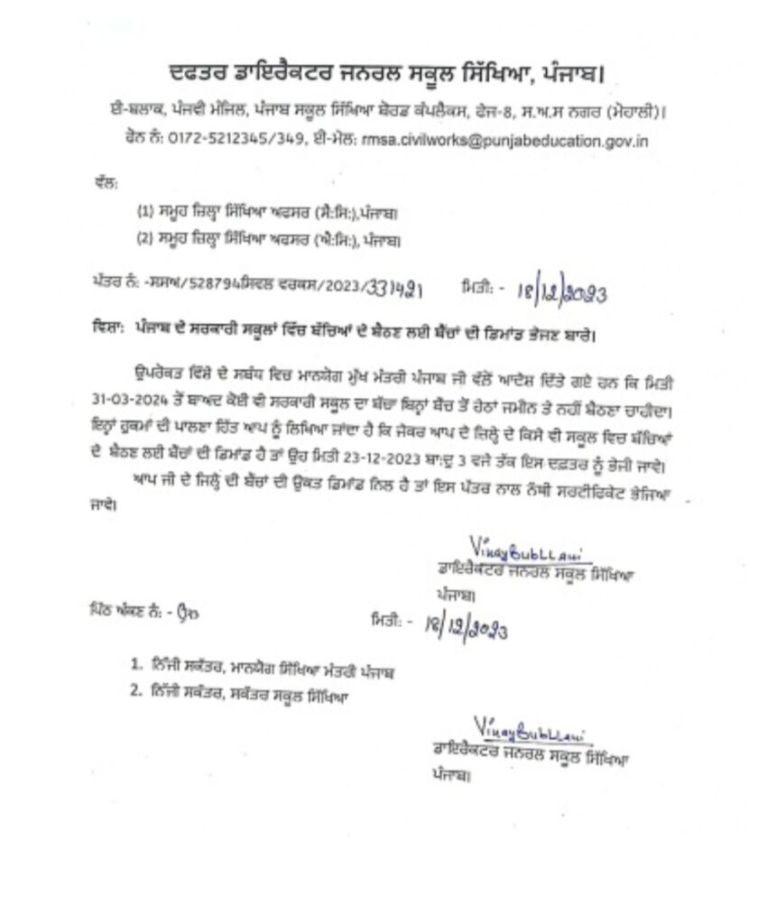 ਉਕਤ ਹੁਕਮਾਂ ਦੇ ਅਨੁਸਾਰ, ਜੇਕਰ ਕਿਸੇ ਜ਼ਿਲ੍ਹੇ ਵਿੱਚ ਕਿਸੇ ਵੀ ਸਕੂਲ ਵਿੱਚ ਬੈਠਣ ਲਈ ਬੱਚਿਆਂ ਲਈ ਬੈਂਚਾਂ ਦੀ ਮੰਗ ਹੈ, ਤਾਂ ਇਸ ਨੂੰ 23 ਦਸੰਬਰ ਤੋਂ ਬਾਅਦ ਦੁਪਹਿਰ 3 ਵਜੇ ਤੱਕ ਦਫਤਰ ਭੇਜਿਆ ਜਾਣਾ ਚਾਹੀਦਾ ਹੈ। ਇਸ ਤੋਂ ਇਲਾਵਾ, ਜਿਨ੍ਹਾਂ ਜ਼ਿਲ੍ਹਿਆਂ ਵਿਚ ਬੈਂਚਾਂ ਦੀ ਮੰਗ ਕੀਤੀ ਗਈ ਹੈ, ਉਨ੍ਹਾਂ ਵਿਚ ਇਸ ਪੱਤਰ ਨਾਲ ਸਬੰਧਤ ਸਰਟੀਫਿਕੇਟ ਭੇਜਿਆ ਜਾਵੇ। ਦੱਸਣਯੋਗ ਹੈ ਕਿ ਅਥਾਰਟੀ ਸਕੂਲਾਂ ਵਿੱਚ ਪੜ੍ਹਣ ਵਾਲੇ ਬੱਚਿਆਂ ਲਈ ਹੁਣ ਵਾਰ-ਵਾਰ ਮਾਨਯੋਗ ਅਧਿਕਾਰੀਆਂ ਰਾਹੀਂ ਅਹਿਮ ਫ਼ੈਸਲੇ ਕੀਤੇ ਜਾ ਰਹੇ ਹਨ ਅਤੇ ਸਰਕਾਰੀ ਸਕੂਲਾਂ ਦਾ ਚਿਹਰਾ ਬਦਲਿਆ ਜਾ ਰਿਹਾ ਹੈ।