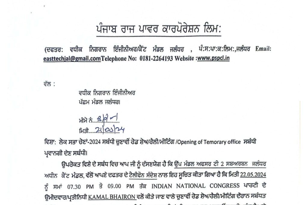 ਜਲੰਧਰ – ਉਪਰੋਕਤ ਵਿਸ਼ੇ ਦੇ ਸਬੰਧ ਵਿਚ ਆਪ ਜੀ ਨੂੰ ਦੱਸਣਯੋਗ ਹੈ ਕਿ ਉਂਪ ਮੰਡਲ ਅਫਸਰ ਟੀ 2 ਸਬਅਰਥਨ ਜਲੰਧਰ ਅਧੀਨ ਕੈਂਟ ਮੰਡਲ, ਵੱਲੋਂ ਆਪਣੇ ਦਫਤਰ ਦੇ ਟੈਲੀਫੋਨ ਸੰਦੇਸ਼ ਨਾਲ ਇਹ ਸੂਚਿਤ ਕੀਤਾ ਗਿਆ ਹੈ ਕਿ ਮਿਤੀ 22.05.2024 ॐ प्रभां 07.30 PM 3 09.00 PM उँर INDIAN NATIONAL CONGRESS भवटी रे ਉਮੀਦਵਾਰ/ਪ੍ਰਤੀਨਿਧੀ KAMAL BHAIRON ਵਲੋਂ ਕੀਤੇ ਜਾਣ ਵਾਲੇ ਚੁਣਾਵੀਂ ਰੋਡ ਸ਼ੋਅ/ਰੈਲੀ/ਮੀਟਿੰਗ ਦੌਰਾਨ ਸਬੰਧਤ ऐठीष्टे BIRRING KAKI PIND LADHEWALI दिधे LT/HT लग्प्ष्टीत’ टी OPTIMUM गड वलीभर्तम वे भडे ਰੋਡ ਸ਼ੋਅ/ਰੈਲੀ/ Opening of Temorary office ਸਬੰਧੀ ਦੇ ਰਸਤੇ ਵਿਚ ਕਿਸੇ ਵੀ ਪ੍ਰਕਾਰ ਦੀ ਬਿਜਲੀ ਲਾਈਨਾਂ/ਖੰਭਿਆਂ ਨਾਲ ਸਬੰਧਤ ਕੋਈ ਰੁਕਾਵਟ ਨਹੀਂ ਹੈ। ਇਸ ਲਈ ਇਸ ਦਫਤਰ ਵਲੋਂ ਹੇਠ ਦਰਸਾਈਆਂ ਸ਼ਰਤਾਂ ‘ਤੇ ਉਪਰੋਕਤ ਚੁਣਾਵੀਂ ਰੋਡ ਸ਼ੋਅ/ਰੈਲੀ/ਮੀਟਿੰਗ/ Opening of Temorary office ਸਬੰਧੀ ਪ੍ਰਵਾਨਗੀ ਦਿੱਤੀ ਜਾਂਦੀ ਹੈ।