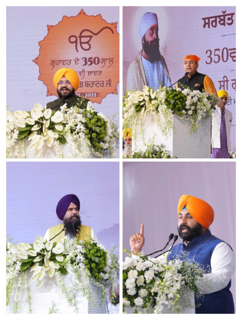 ਮੁੱਖ ਮੰਤਰੀ ਭਗਵੰਤ ਸਿੰਘ ਮਾਨ ਦੀ ਅਗਵਾਈ ਵਾਲੀ ਪੰਜਾਬ ਸਰਕਾਰ ਵੱਲੋਂ ਨੌਵੇਂ ਸਿੱਖ ਗੁਰੂ ਸਾਹਿਬ ਸ੍ਰੀ ਗੁਰੂ ਤੇਗ਼ ਬਹਾਦਰ ਸਾਹਿਬ ਜੀ ਦੇ 350ਵੇਂ ਸ਼ਹੀਦੀ ਦਿਹਾੜੇ ਨੂੰ ਸਮਰਪਿਤ ਇੱਕ ਵਿਸ਼ਾਲ “ਸਰਬੱਤ ਦਾ ਭਲਾ ਇਕੱਤਰਤਾ” ਸਮਾਗਮ ਕਰਵਾਇਆ ਗਿਆ। ਇਸ ਦੌਰਾਨ ਸੀਨੀਅਰ ਆਗੂਆਂ ਨੇ ਸੰਗਤ ਨੂੰ ਸੰਬੋਧਨ ਕਰਦਿਆਂ ਗੁਰੂ ਸਾਹਿਬ ਜੀ ਦੀ ਲਾਸਾਨੀ ਸ਼ਹਾਦਤ ਨੂੰ ਸ਼ਰਧਾਂਜਲੀ ਭੇਟ ਕੀਤੀ ਅਤੇ ਇਸ ਇਤਿਹਾਸਕ ਸਮਾਗਮ ਨੂੰ ਕਰਵਾਉਣ ਸਬੰਧੀ ਸਰਕਾਰ ਦੇ ਯਤਨਾਂ ‘ਤੇ ਚਾਨਣਾ ਪਾਇਆ।