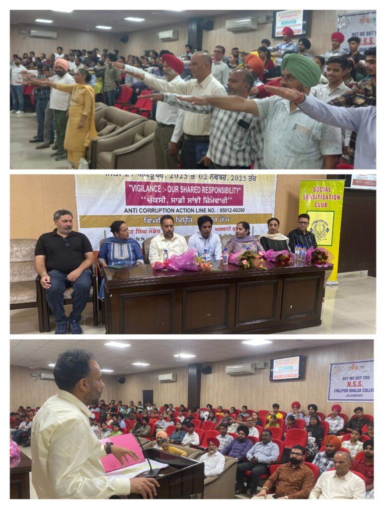 ਜਲੰਧਰ, 29 ਅਕਤੂਬਰ: ਸੂਬੇ ਨੂੰ ਭ੍ਰਿਸ਼ਟਾਚਾਰ ਮੁਕਤ ਬਣਾਉਣ ਲਈ ਪੰਜਾਬ ਸਰਕਾਰ ਦੀਆਂ ਹਦਾਇਤਾਂ ਅਨੁਸਾਰ ਵਿਜੀਲੈਂਸ ਬਿਊਰੋ, ਪੰਜਾਬ ਵੱਲੋਂ ‘ਚੌਕਸੀ: ਸਾਡੀ ਸਾਂਝੀ ਜ਼ਿੰਮੇਵਾਰੀ’ ਥੀਮ ਤਹਿਤ 2 ਨਵੰਬਰ ਤੱਕ ਮਨਾਏ ਜਾ ਰਹੇ ਵਿਜੀਲੈਂਸ ਜਾਗਰੂਕਤਾ ਹਫ਼ਤੇ ਤਹਿਤ ਵਿਜੀਲੈਂਸ ਬਿਊਰੋ, ਯੂਨਿਟ ਜਲੰਧਰ ਵੱਲੋਂ ਅੱਜ ਸਥਾਨਕ ਖਾਲਸਾ ਕਾਲਜ ਵਿਖੇ ਸੈਮੀਨਾਰ ਕਰਵਾਇਆ ਗਿਆ।