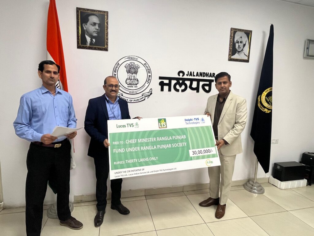 ਜਲੰਧਰ, 13 ਨਵੰਬਰ : ਡਿਪਟੀ ਕਮਿਸ਼ਨਰ ਡਾ. ਹਿਮਾਂਸ਼ੂ ਅਗਰਵਾਲ ਨੂੰ ਹੜ੍ਹ ਦੀ ਪੀੜਤਾਂ ਦੀ ਮਦਦ ਲਈ ਲੁਕਾਸ ਇੰਡੀਅਨ ਸਰਵਿਸ ਲਿਮਟਿਡ, ਲੁਕਾਸ ਟੀ.ਵੀ.ਐਸ. ਲਿਮਟਿਡ ਅਤੇ ਡੇਲਫੀ ਟੀ.ਵੀ.ਐਸ. ਟੈਕਨਾਲੋਜੀਜ਼ ਲਿਮਟਿਡ ਵੱਲੋਂ 10-10 ਲੱਖ ਰੁਪਏ (ਕੁੱਲ 30 ਲੱਖ ਰੁਪਏ) ਦਾ ਚੈੱਕ ਰੰਗਲਾ ਪੰਜਾਬ ਸੁਸਾਇਟੀ ਅਧੀਨ ‘ਮੁੱਖ ਮੰਤਰੀ ਰੰਗਲਾ ਪੰਜਾਬ ਫੰਡ’ ਲਈ ਸੌਂਪਿਆ ਗਿਆ।